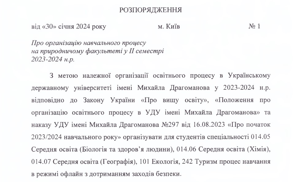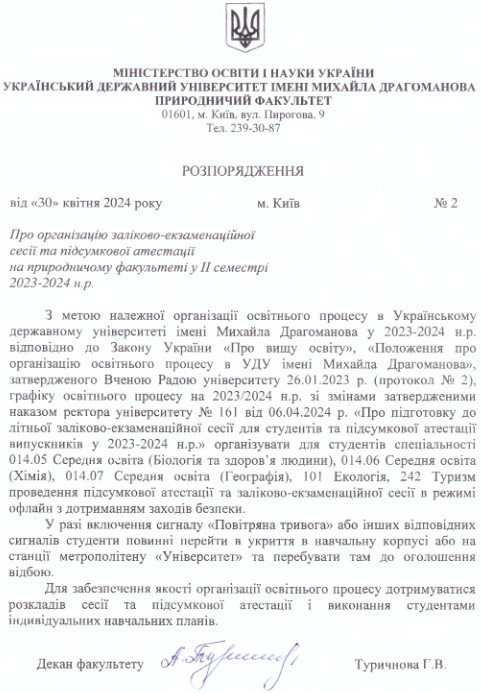 З метою належної організації освітнього процесу в Українському державному університеті імені Михайла Драгоманова у 2023-2024 н.р. відповідно до законодавства України організувати для студентів спеціальності 014.05 Середня освіта (Біологія та здоров’я людини), 014.06 Середня освіта (Хімія), 014.07 Середня освіта (Географія), 101 Екологія, 242 Туризм проведення підсумкової атестації та заліково-екзаменаційної сесії в режимі офлайн з дотриманням заходів безпеки.