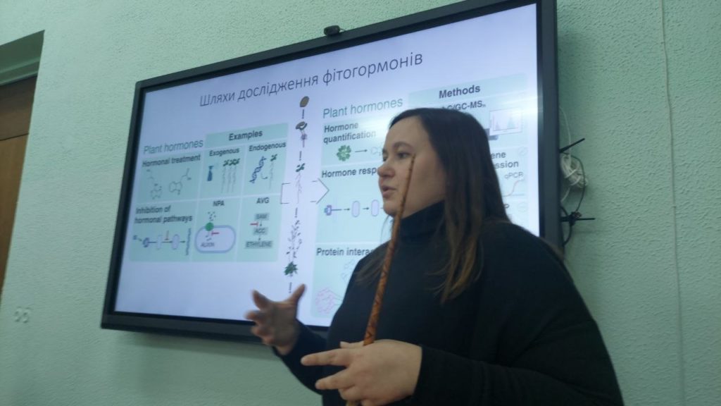 Відбулася гостьова лекція випускниці кафедри біології, нині - наукової співробітниці Відділу клітинної біології і біотехнології Інституту харчової біотехнології та геноміки НАН України, постдока в дослідницькій групі Яна Хеятко центру геноміки та протеоміки рослин імені Г. Менделя Центральноєвропейського технологічного інституту Університету Масарика (Брно, Чехія) кандидата біологічних наук Надії Олександрівни Пушкарьової на тему: "Молекулярна дія рослинних регуляторів росту цитокінінів, або улюблені іграшки в лабораторії".