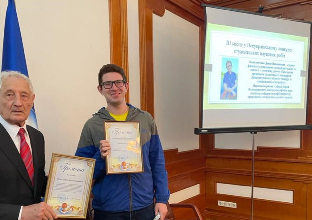 Полтавченка Дениса, студента факультету природничо-географічної освіти та екології, та його наукового керівника Сергія Міхелі, доктора географічних наук, професора кафедри географії, з перемогою (Диплом ІІІ ступеня) у ІІ турі Всеукраїнського конкурсу студентських наукових робіт з географії