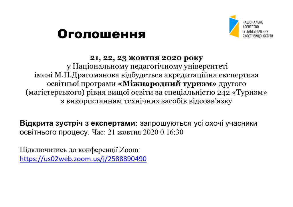У Національному педагогічному університеті імені М.П.Драгоманова відбудеться акредитаційна експертиза освітньої програми «Міжнародний туризм» другого (магістерського) рівня вищої освіти за спеціальністю 242 «Туризм» з використанням технічних засобів відеозв’язку